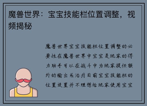 魔兽聊天界面如何移动图标显示位置 在魔兽世界游戏中,聊天界面是玩家与其他玩家进行交流的重要工具。有时候聊天界面中的图标显示位置可能会影响到玩家的游戏体验。本文将详细介绍如何移动魔兽聊天界面中的图标显示位置,以满足玩家的个性化需求。 1. 了解魔兽聊天界面 在开始移动图标显示位置之前,玩家首先需要对魔...